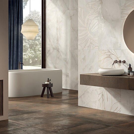 Ispirazioni di abbinamenti cromatici, ma anche accostamenti modulari di formati tracciano e valorizzano l’aspetto della superficie. Forme estese abbinate a tessere raffinate di mosaico valorizzano i volumi e definiscono con carattere lo spazio.